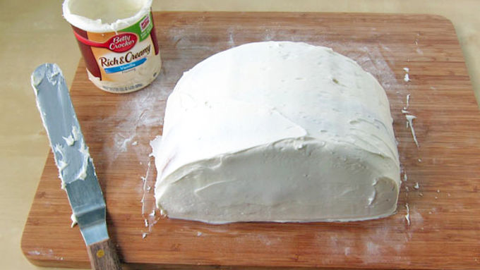 Step9Cut a piece of cake board the size of the bottom of the rainbow cake. Pick up the cake and turn it so that the rainbow is facing you, not laying flat, and set the cake on the board. Use a container of frosting to frost the cake, making it as smooth as possible.