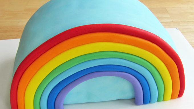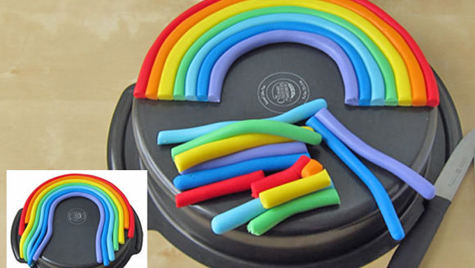 Step12Create a rainbow by coloring pieces of fondant (about 1 ounce each) using violet, indigo, blue, green, yellow, orange and red coloring. Roll each color into a long log.