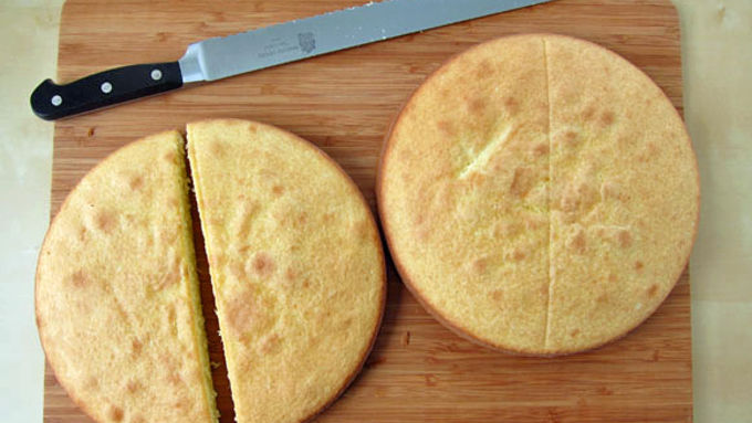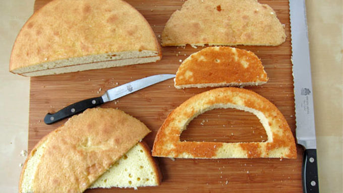 Step5Remove all the scraps and crumbs from your work surface, leaving your two cut-out cakes and two whole cakes.