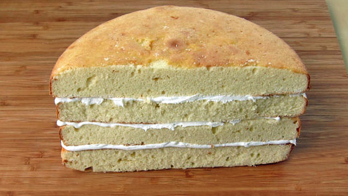 Step3Measure and cut cakes in half, so you have four rainbow shaped cakes. Set the cakes on top of each other to make sure they are all the same size. If not, cut off any excess.