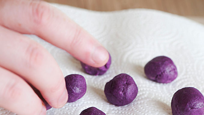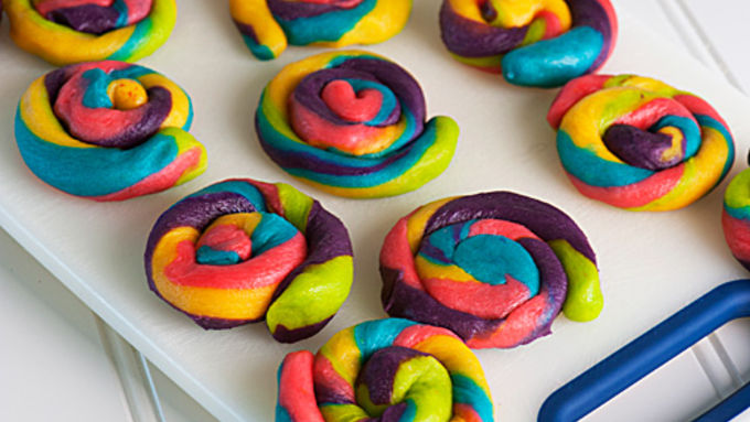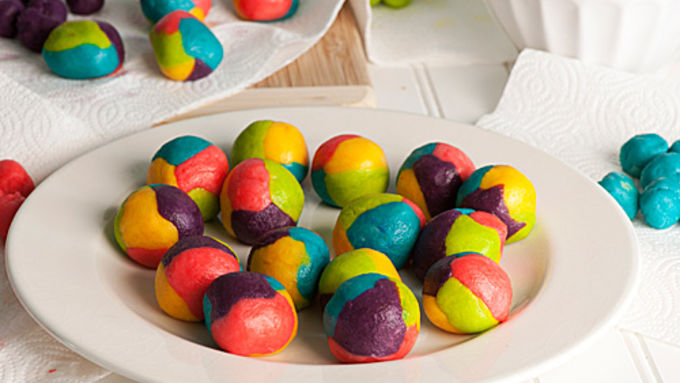 Step1Preheat oven to 350°F. Divide dough evenly into five bowls, and color each with a different color liquid food coloring. (We used Betty Crocker neon shades in pink, green, blue and purple, as well as the yellow from a standard pack). Roll each color dough into 14 grape-sized balls.