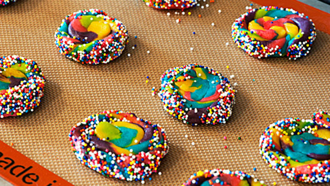 - A little food coloring is all takes to step up your sugar cookie game. Step it waaaay up! The technique for assembling these Rainbow Pinwheel Cookies could not be easier. No precise measurement, rolling pin action, or squaring-off of dough blocks is required. If the dough starts to get a little soft while you're coloring it, pop the balls into the fridge for about 20 minutes to firm back up. The twisting step is key: it's what gives the cookies their zany candy-stripe, pinwheel effect. Finally, dip the edges of the cookies in sprinkles and bake. Easy peasy! This method would be a hit for making cookies in holiday colors or for themed/game day parties. We hope you enjoy it!