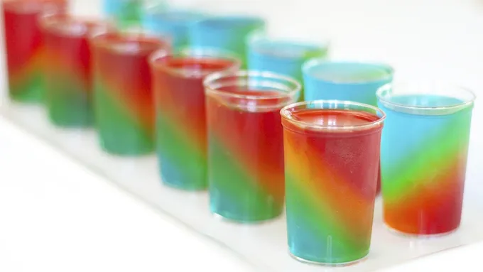 Step4Place saucepan over medium heat until it comes to a light simmer. Remove from heat and add 1 cup rainbow sherbet-flavored vodka. Slowly pour orange and vodka mixture on top of slightly set lime mixture. Refrigerate for about 20 minutes or until slightly set. (Should be sticky but not firm.)
