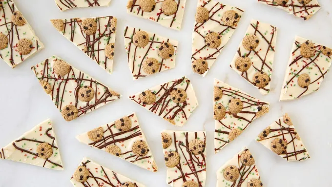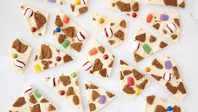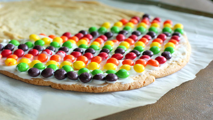 Step3Melt half of candy coating according to the package directions and lather it on half of the cookie. Doing it in batches ensures that the coating doesn't dry out while decorating. Decorate the cookie bark with assorted rainbow candies. Repeat with other half.