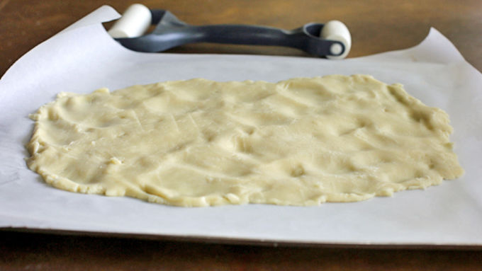 Step1Roll out cookie dough onto a parchment lined baking sheet into a rectangle about 1/4 inch thick. Use a little flour on the rolling pin if it becomes sticky.