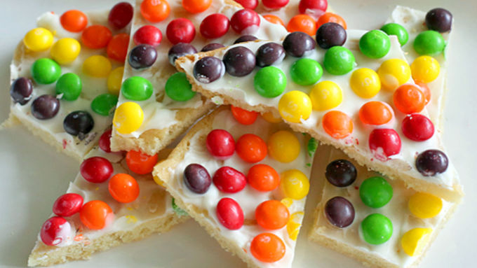 - At Tablespoon we love rainbows, as you well know. And now, we've taken the rainbow to a whole new level that will have the kids screaming in joy and the adults watering at the mouth. This Rainbow Sugar Cookie Bark, inspired by the blog, momontimeout, looked like so much fun that I just had to do this with my kids. This is a giant sugar cookie lathered with vanilla coating and then sprinkled with whatever rainbow colored candy suits your fancy. Once you've baked and cooled the cookie, spread half of the vanilla coating on top and decorate with your colorful candies. You want to do it in batches so that the coating doesn't cool too quickly. Decorate in whatever pattern you like. There are no rules here! Let the bark set and then cut or break the bark into pieces. The rustic look is totally okay here. My boys couldn't wait to take a bite. I had to shoo their hands away so I could get a picture. Enjoy!