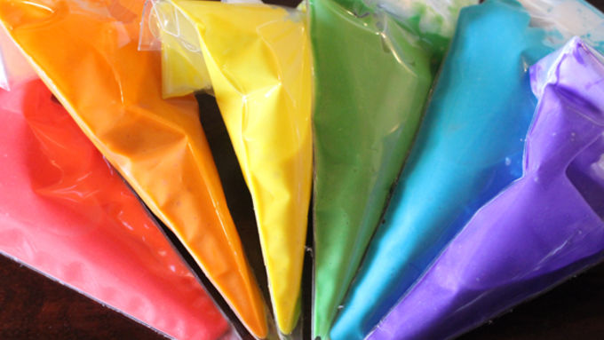 Step4Transfer each color of batter to its own piping bag and cut off the tips (careful not to spill the batter).