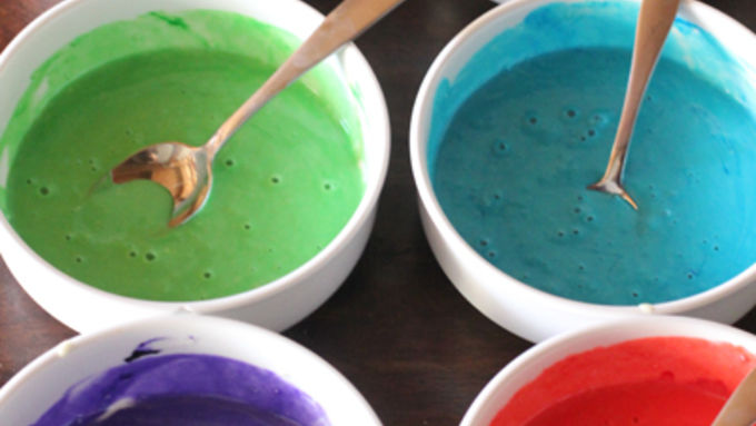 Step3Use gel food coloring (red, orange, yellow, green, blue, purple) to color each bowl of batter to your desired vibrancy. Whisk in food coloring until evenly blended.