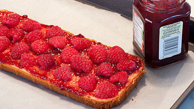 Step2Spread the bottom layer with 2 tablespoons raspberry jam. Take one package of raspberries, and slice the berries in half. Arrange half of the cut berries in a layer on top of the jam.