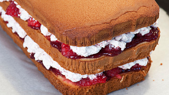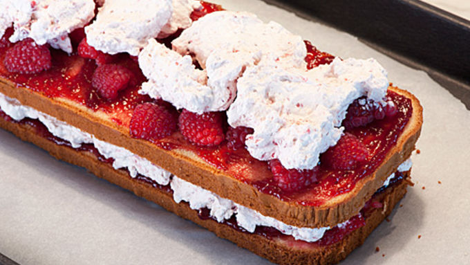 Step4Place the second cake layer on top of the raspberry whipped topping. Spread with remaining 2 tablespoons jam, top with cut berries, and dot and spread the remaining whipped topping mixture. Top with final cake layer. Cover with plastic wrap and refrigerate at least 1 hour (up to overnight).