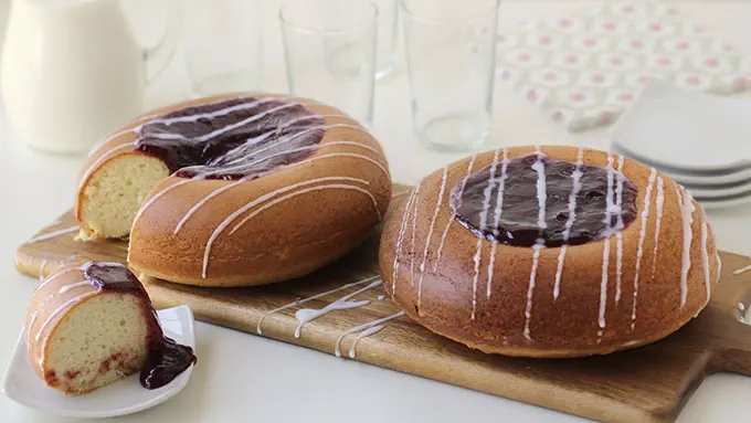 A giant version of a thumbprint cookie made out of cake, filled with raspberry jam and drizzled with sweet glaze.