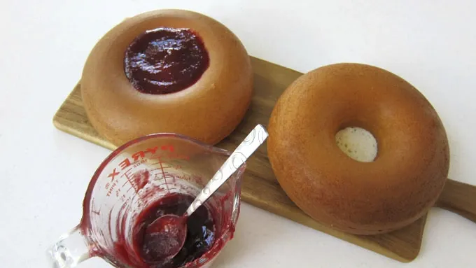 Step6Pour raspberry jam into a microwave-safe bowl. Heat for 10-20 seconds to soften. Pour half of the jam into the indentation in each cake, filling the cakes to the top.