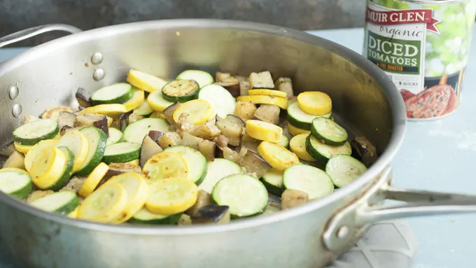 Step3Add chopped zucchini, squash and onion to the skillet. Cook for another 5 to 6 minutes. If the skillet seems very dry, feel free to add an extra drizzle of oil. It’s okay if some of the eggplant sticks to the skillet though.
