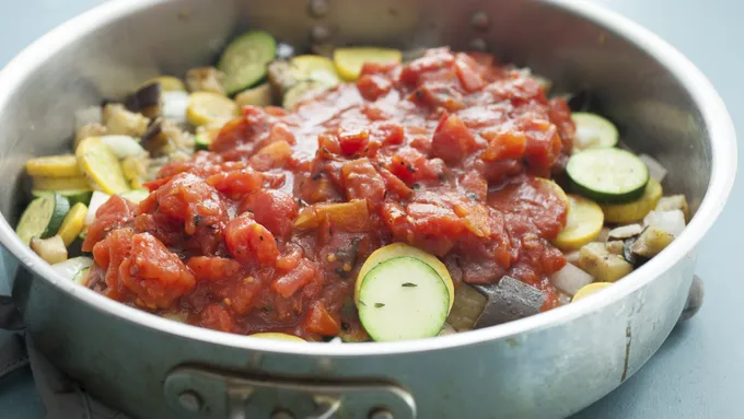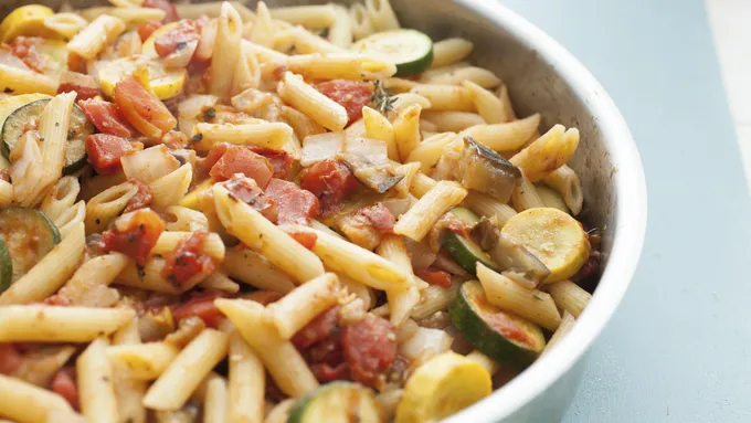 All the fresh, summery flavors of classic French ratatouille—eggplant, zucchini, squash, onion, garlic and tomato—are tossed together with penne pasta in this user-friendly take on the famous vegetable casserole.