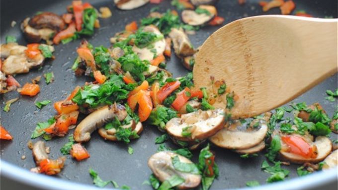 Step2Heat the oil in a skillet over medium high. Add the shallots and cook 1 minute. Toss in the red bell pepper and mushrooms. Cook until the mushrooms start to brown, 6 minutes. Season with salt and pepper. Add the spinach and wilt, 1 minute.
