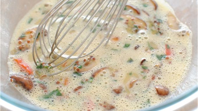 Step3In a large bowl, whisk the eggs until combined. Add the sautéed veggies. Then add in the quinoa. Whisk until combined. Season with salt and pepper. Toss in the grated cheese.