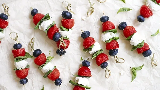 - Cute, easy and 4th of July ready. Drop everything. Stop doing whatever you’re doing and make these Red, White and Blue Bites. It’s that important because these babies are BOMB. They’re also insanely easy to make. Like, I feel silly even giving you a recipe for this. But I will, because there is a method to the skewering. There is not, however, a method to eating them. Unless you count shoveling as a method—because that’s the route I took straight to my mouth when I made these refreshing, easy, no-bake appetizers. In addition to shoveling in one’s mouth, they also happen to be great for summer outdoor food festivities such as picnics and potlucks and gatherings around the campfire singing “Kumbaya” – if that’s a thing you do. Ahem. To start, you’ll need a couple of blocks of salty feta cheese. Use a melon baller or a very small cookie scoop to scoop out 1-inch balls of feta from the blocks. These are so patriotic and fun and easy and tasty and refreshing and sweet and salty and flavorful and really, I could go on and on about them but I think it’s in all of our best interests at this point to do as I said before… Drop everything and make these bomb bites! Eating them whilst singing “Kumbaya” is optional. Perhaps the Pledge of Allegiance is better?