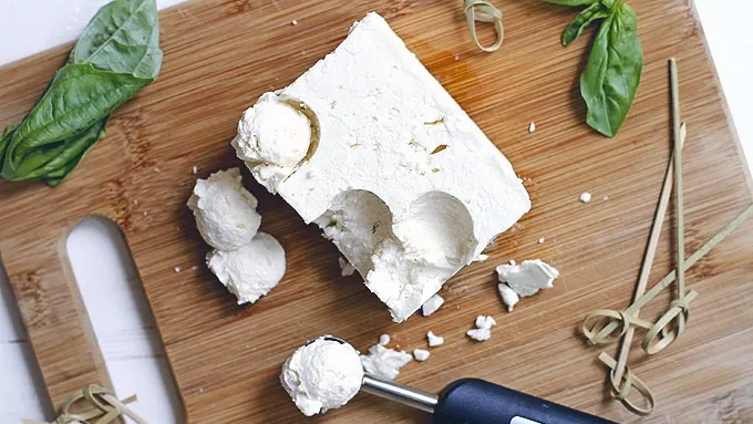 Step1Use a melon baller or small cookie scoop to carefully scoop about 24 (1-inch) balls of feta cheese from each block/chunk.