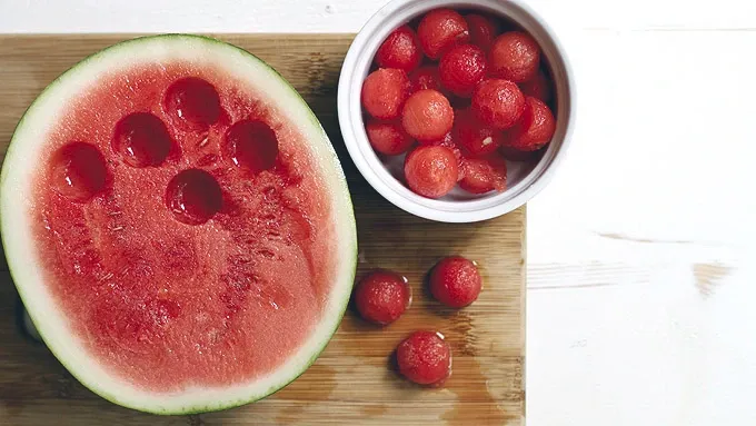 Step2Use a clean melon baller to scoop approximately 48 (1-inch) balls from the watermelon.