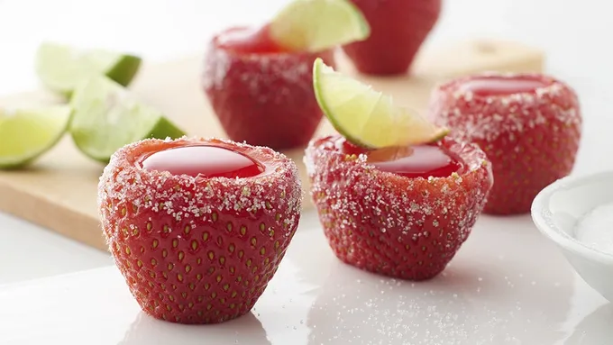- Strawberries get all patriotic in red, white and blue with the help of some yummy spiked gelatin. How do you take a good thing (jelly shots in strawberries) and make it better? Add more color! Even better, AMERICAN colors. These little filled bites looked so ready for the 4th that we almost called them ‘merica jelly shots! With bright red strawberries, and white and blue gelatin filling, these couldn’t be cuter or more party perfect. I’ve been brainstorming on this forever and I wasn’t sure how they were going to turn out, but I think they are perfection. Since no one really eats a whole huge strawberry all at once, these strawberry halves are perfect one biters. You can arrange them in a circle, square or even a star on a serving plate for the perfect presentation. Give them a try this 4th of July—or Flag Day, Labor Day, Veteran’s Day, or Memorial Day—or ANY day you’re feeling the spirit!