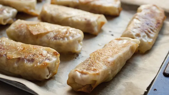 Step5Bake egg rolls for 20 minutes, flipping them once halfway through until crispy and browned.