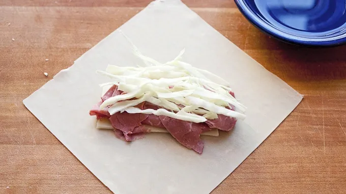 Step2Working with one egg roll wrapper at a time, add half a slice of Swiss cheese to the center, followed by a slice or two of corned beef and a handful of fresh cabbage.