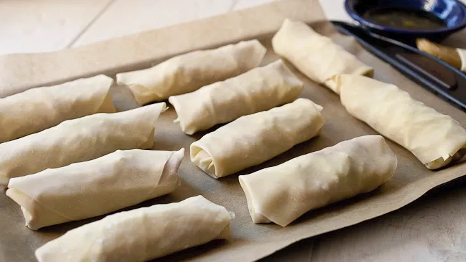 Step4Repeat with all egg rolls, then brush egg rolls with olive oil.