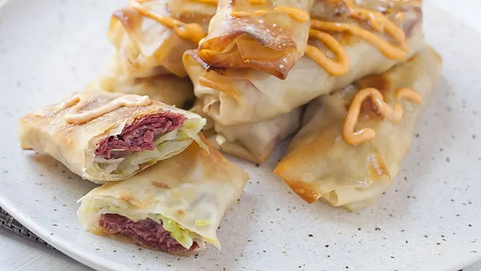 - St. Patty’s Day is known for a few things. Green beer, for one. But it’s probably better known for corned beef and cabbage. It’s the classic St. Patty’s Day meal—and with good reason. If you don’t feel like making the whole spread though, these little Reuben egg roll appetizers have all the same flavors and are really easy to make! You only need a few ingredients. Get good corned beef from your deli and have them slice it thin. Then you just need some fresh cabbage and Swiss cheese. Bake these beauties for about 20 minutes at 400ºF. Turn them once halfway through. The finished egg rolls should be crispy and golden brown. A drizzle or dip in Thousand Island dressing is a must!