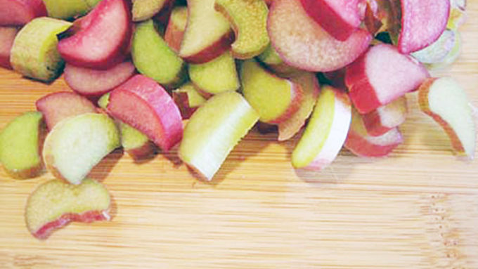 Step4Stir wet ingredients into dry ingredients along with chopped rhubarb.