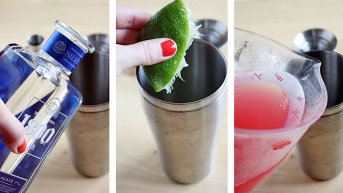 Step3Add tequila and lime juice to cocktail shaker and cover; shake to combine.