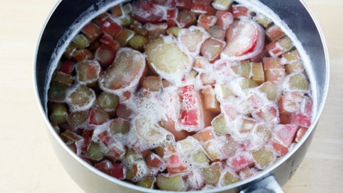 Step1In a medium saucepan over high heat, bring rhubarb, sugar, water and vanilla extract to a boil. Reduce heat and simmer for 6-7 minutes. Remove from heat; cool to room temperature.