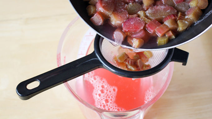 Step2Strain syrup from rhubarb into a measuring cup. Discard rhubarb (or use as compote) and pour 8 ounces rhubarb simple syrup into a cocktail shaker. (The remainder can be refrigerated in a covered container for 1-2 weeks.)