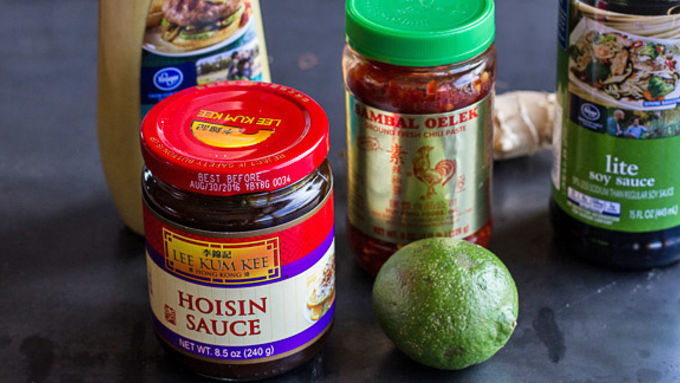 Step6Meanwhile combine the remaining 1/2 cup hoisin sauce, 1/4 cup soy sauce, sambal oelek, ginger, 1 teaspoon rice wine vinegar, lime juice and 2 tablespoons cilantro. Whisk well and place in the fridge until ready to serve.