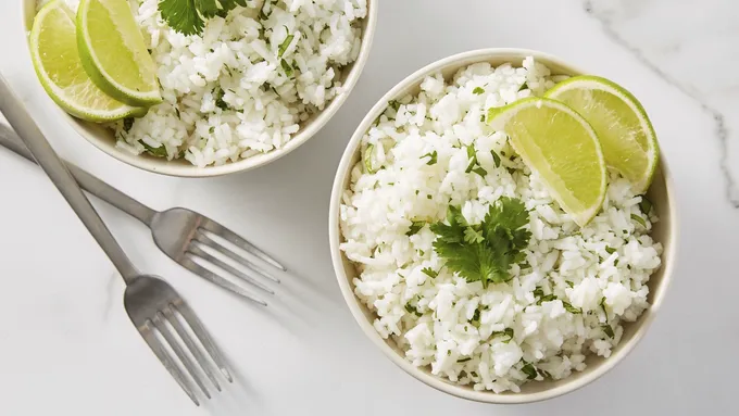 Step1Place the rice and coconut milk in a rice cooker. (Alternately, cook over the stove.) Cook until done. Once cooked, add the cilantro and the juice from half the lime. Toss together.