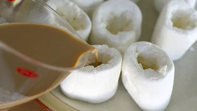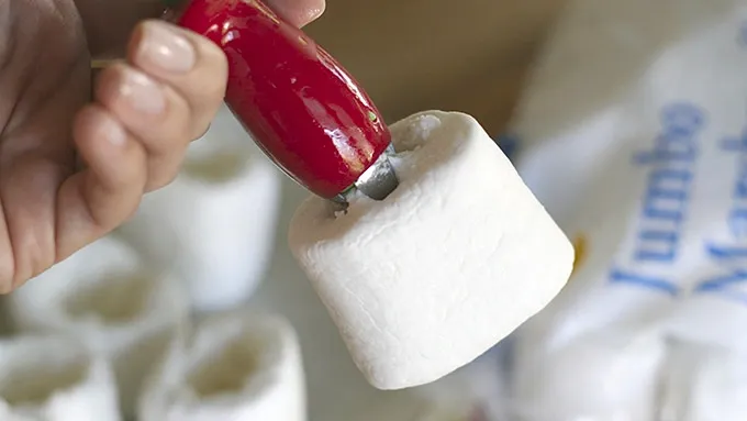 Step1Using a strawberry huller or simply your fingers, hollow out a "well' in each marshmallow, taking care not to tear holes in the bottom or sides.