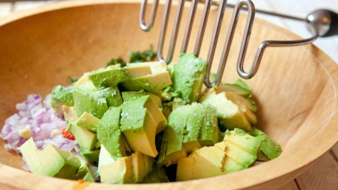 Step3Cut avocados in half and remove seeds. Scoop soft flesh into bowl and mash together with other ingredients using a potato masher or large fork.