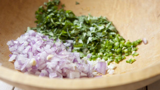 Step2Meanwhile, add minced onion, garlic, serrano pepper, cilantro and lime juice in a medium bowl. Season with a pinch of salt.