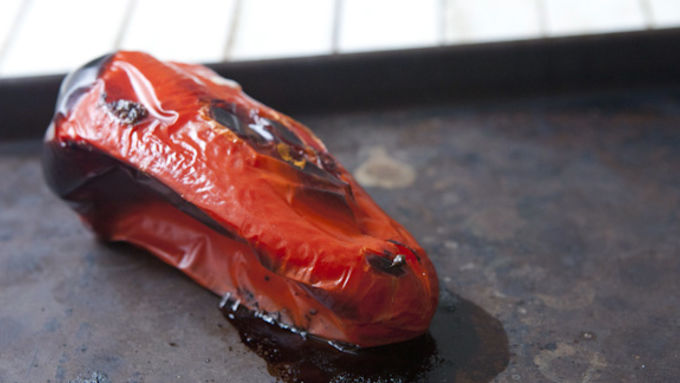 Step1Preheat oven to 450°F. Roast red pepper on a baking sheet for 15-20 minutes, turning once until skin is very blistered and blackened. Remove pepper from oven and place in a bowl. Cover with plastic wrap and let steam for 5 minutes.