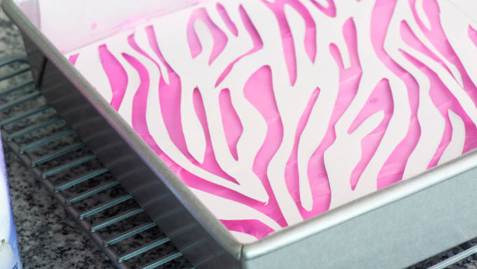 Step4Once the pink spray has completely set, place the template gently on the top (don't press!). Holding the purple edible cake decorating spray at least 9 inches above the brownie pan, rotating around to all areas of the pan to cover evenly with the spray. You'll need to do several passes to get an even color, but this is necessary as being more aggressive with the spray will cause the template to move around, and your zebra effect won't be as distinct. Allow the purple spray to dry for a bit while you make the stars.