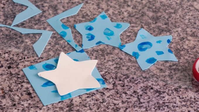 Step7Remove the backing of the blue sugar sheet, and using cardboard stencil (I cut one out of the cardboard in the sugar sheet package), cut out star shapes. Set aside on wax paper until ready to use.
