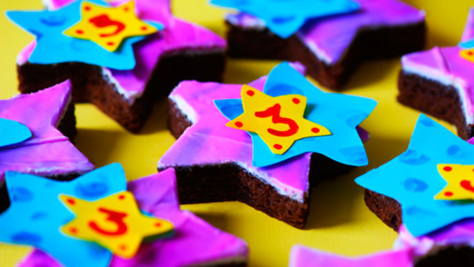 - Here's a fun and absolutely delightful way to celebrate a birthday! And I can't think of a better b-day creation to celebrate with than a batch of party rockin' Rockstar Brownies! So to really do this right, I’m thinking nothing says rockstar than day-go colors, mildly inappropriate spandex, and oversized party shades are the first things to come to mind. There’s not much I can do about the tights and festive eyewear, in the vein of party treats at any rate (thank goodness), but animal prints and day-glo are both easily accomplished. First, you’ll need a pan of brownies, baked according to your recipe or package directions, and cooled. I’m a Betty Crocker Fudge Brownie mix girl, myself. I made the 18.3 oz family-size box for this endeavor, increasing the eggs by 1 (for more cake-like brownies, per the package directions). The stars are made with yellow and blue sugar sheets. I love sugar sheets, as to be perfectly honest, despite my love of food bling I’m not adept or skilled enough to roll fondant at this juncture. The sugar sheets are easy to work with and are also relatively inexpensive at about $4 per sheet. Enjoy your brownies, dance at your party, and make sure every day you're a shuf-shuf-shufflin. More Birthday Faves Keep the party going with these birthday treats!