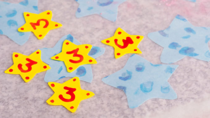 Step8Remove backing of the yellow sugar sheet, and cut out stars (again with a stencil). Decorate the stars as desired - I used a red food coloring/vodka mixture to make 3's to celebrate Tablespoon's birthday.