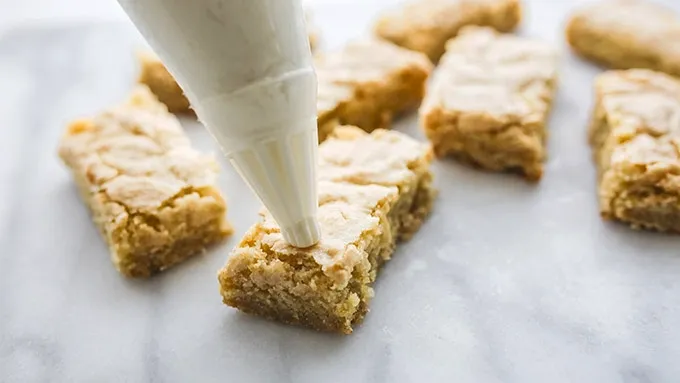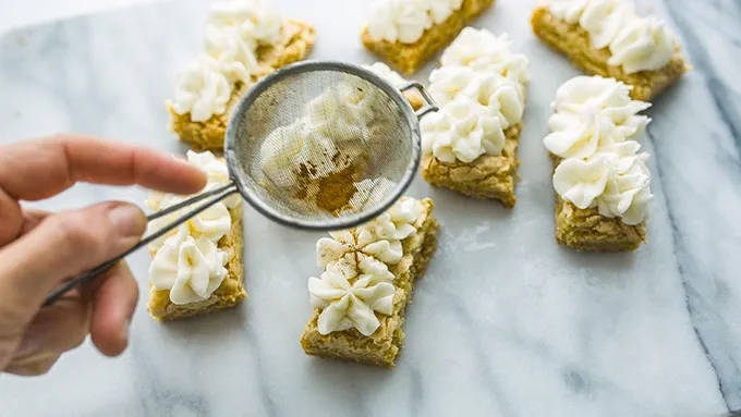 You can spread the frosting on top, no problem, but I think these bars are approximately 8x cuter when the frosting is piped on with a star tip. It looks just like a cuppa RumChata™ topped with whipping cream. (Except it’s a cookie bar.)