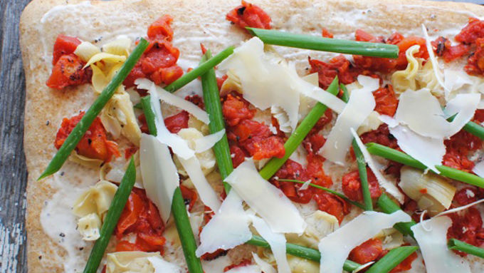 Step3Remove from oven and spoon the peppercorn ranch over the crust. Then top with diced tomatoes, artichoke hearts, scallions and parmesan shavings.