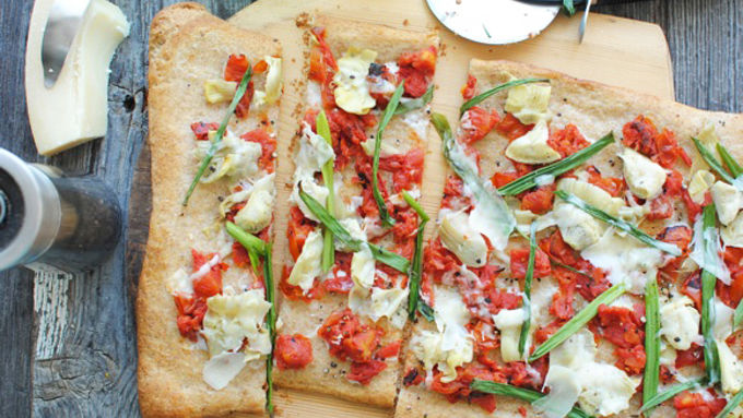 - I love meals that are easy. But, what I love even MORE are meals that look all faincy pants and gourmet and like you ALMOST DIED SLAVING AWAY for one hundred thousand years in the kitchen, uphill, in the snow, with no shoes on, for 24 miles, one way, but guess what. The joke's on them. Or in my case, my imaginary friends, WHAT. All you need is a Pillsbury Artisan Pizza Crust with Whole Grain, some peppercorn ranch, artichoke hearts, Muir Glen fire roasted tomatoes, parmesan cheese, and some scallions. Weird combo, huh? Just you wait. Layer, layer, layer. Bakey bake bake. Throw some more cracked black pepper and parmesan shavings on top and it's the tastiest meal ever.