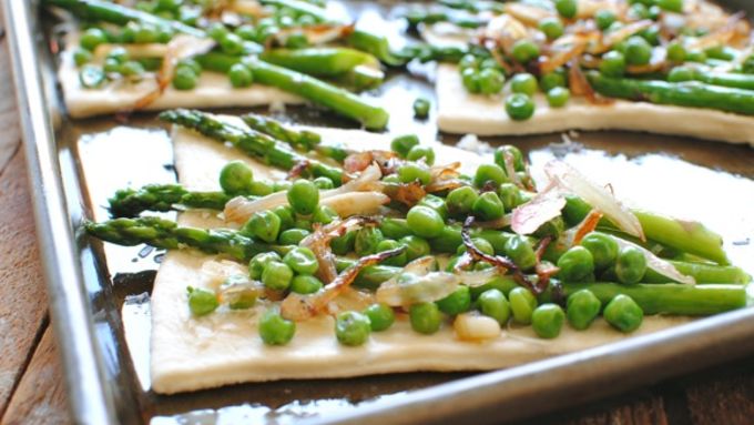 - We've all been there. At least once. And sometimes we have a feeling it's going to happen. Like some little squeaky voice in our gut just lets us know. But other times it hits us upside the head like a yellow foam Nerf bat, minus the yellow foam Nerf part. I'm talking about: A kitchen fail. Being a food blogger, there are two types of kitchen fails for me. Ones that maybe sort of fail but it still tastes totes pimp and you can garnish it with this or that, trim up an edge, position it to see only the purty sides. And then there are the ones that send you straight to the self-esteem camp sign up forms, and then back to bed. With a bottle of red wine. I'M KIDDING, YOU GUYS. It would be a bottle of white wine. So yeah, Weidner kitchen fail of spring just happened. I had this way tubular idea to use thin crust pizza dough in place of a QUICHE CRUST. Cute, right? And I was going to make mini pizza quiches in little muffin tins for all the world to see and enjoy. And then my whole life fell apart like a scene in an Arnold Schwarzenegger movie and things were burning and exploding and sticking and there were car chases and collapsing buildings and my hair fell out. You feel me. So, I had some leftover Pillsbury™ pizza dough (thank the ponies) and a bunch of spring veggies (thank the baby puppies) so my noggin cranked into overdrive because my stomach was eating my head and I was about to pass out. And then we had these gawgeous rustic spring pizzettes! Being a failure rules! And we have half a dough ball from Pillsbury™ (don't laugh) some peas, asparagus, shallots, garlic, some herbies, oil and cheese. There we have it. True love.