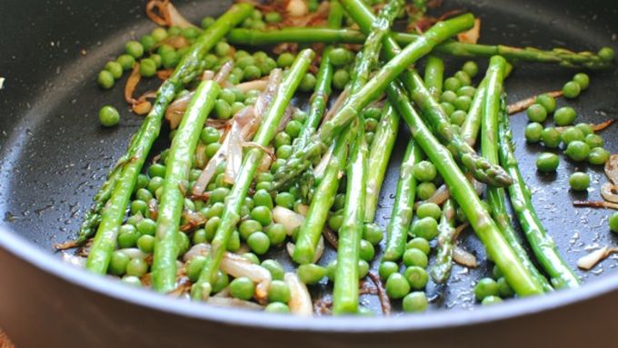 Step3Add the asparagus and peas. Saute until they are bright green in color and crisp-tender, another 3 minutes. Season with salt and pepper.