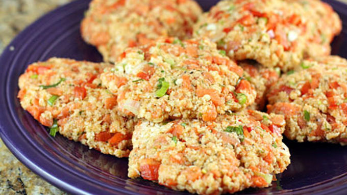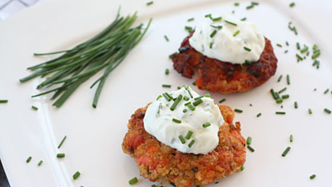 Fresh salmon and herbs are formed into a slightly spicy cake and lightly pan-fried to golden-brown perfection. Served with a lemon-chive yogurt sauce.