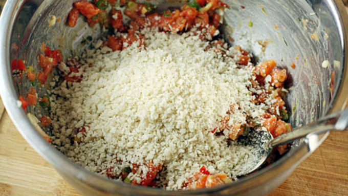 Step2Add in Panko bread crumbs 1/2 cup at a time until the mixture holds its shape. Try not to add to many bread crumbs and don't overmix the mixture. Try to keep it nice and light.