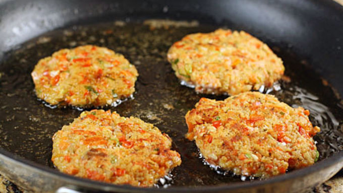 Step4Heat frying oil in a large skillet over medium high heat. Once hot, fry patties for about 3 minutes on each side until they are nicely browned. Don't overcook them or they'll get dry.